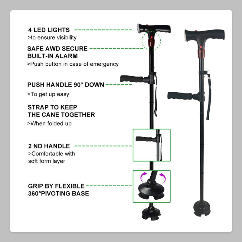 Designad med moderna seniorer i åtanke, denna käpp kombinerar avancerade funktioner med användarvänlig design för att ge oöverträffat stöd. De integrerade larm- och LED-lamporna garanterar säkerhet och bekvämlighet, medan det dubbla handtaget och den roterande fotplattan ger större komfort och stabilitet. Det är det perfekta valet för dem som med säkerhet vill behålla sin rörlighet utan att kompromissa med stil eller säkerhet.