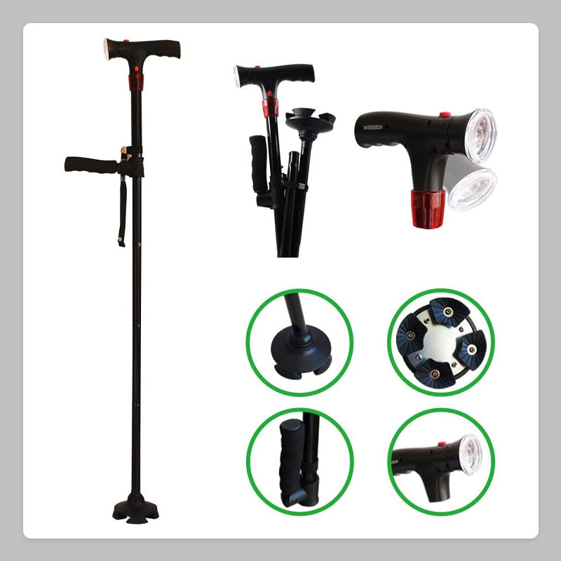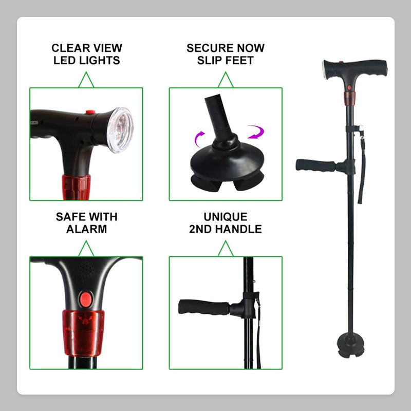 Ljusa LED-ljus: Utrustad med LED-lampor lyser denna käpp upp din väg i svagt ljus och gör det säkrare att gå på natten eller i svagt upplysta områden. Lamporna är bekvämt placerade för att säkerställa optimal synlighet utan bländning.